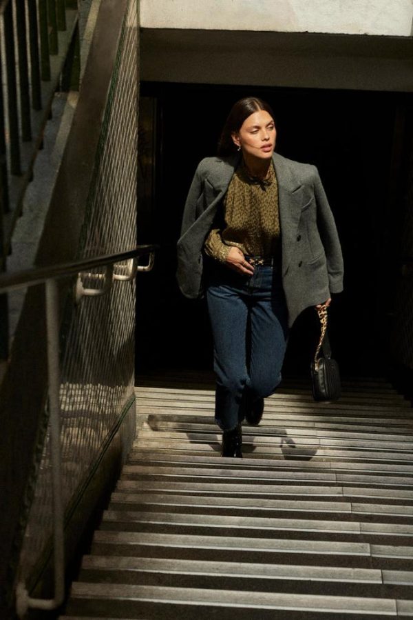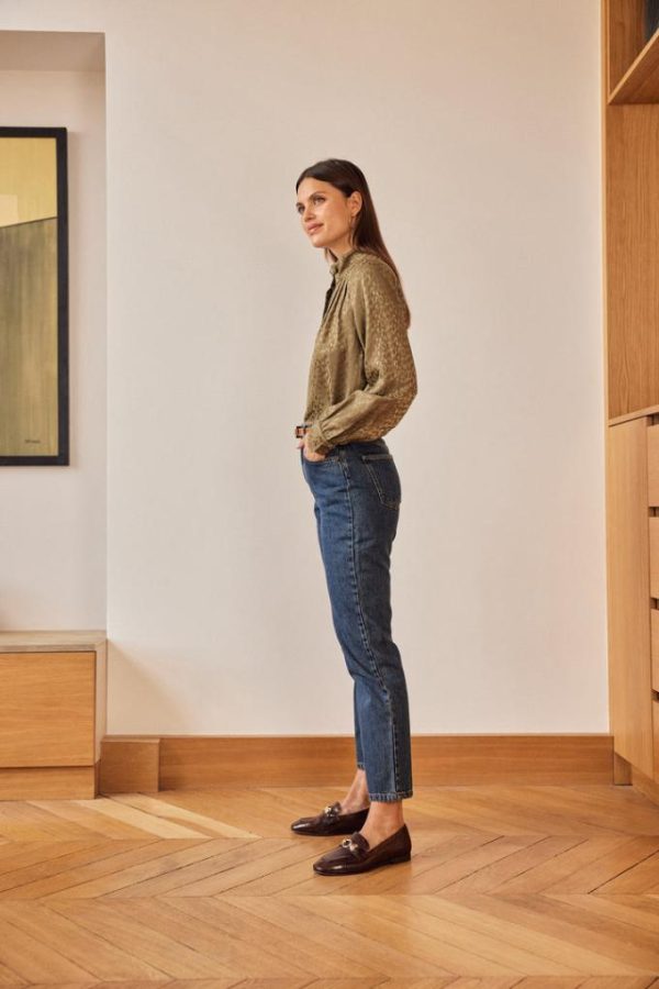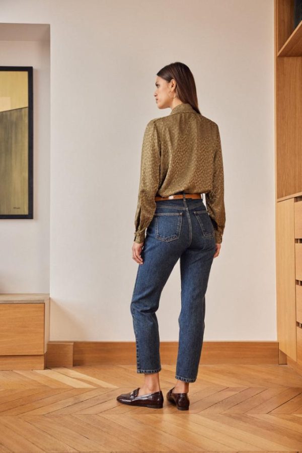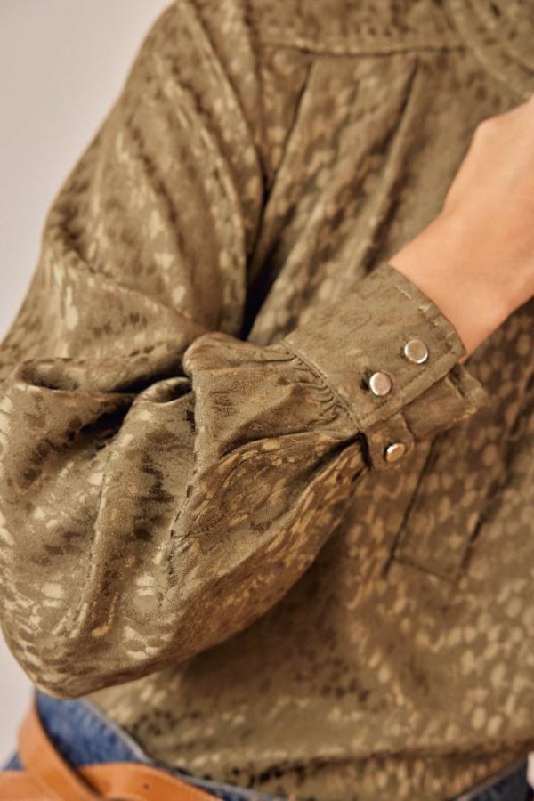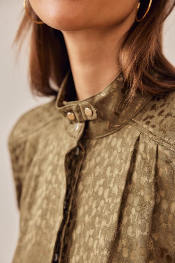 Délicate et soignée, la blouse Palmyre jacquard kaki constitue la pièce mode d’une tenue.