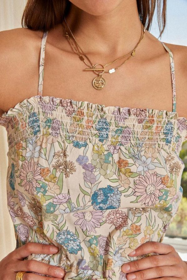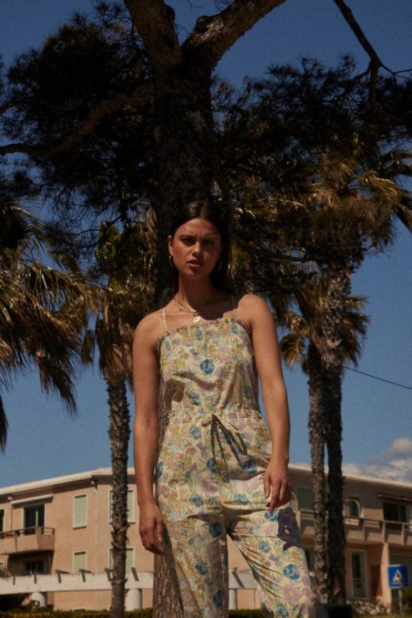 Estivale, la combinaison Komodo imprimé fleurs d’été marque la taille avec sa ceinture à nouer.