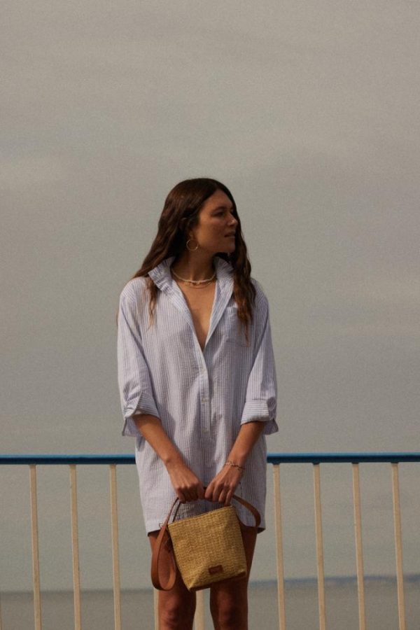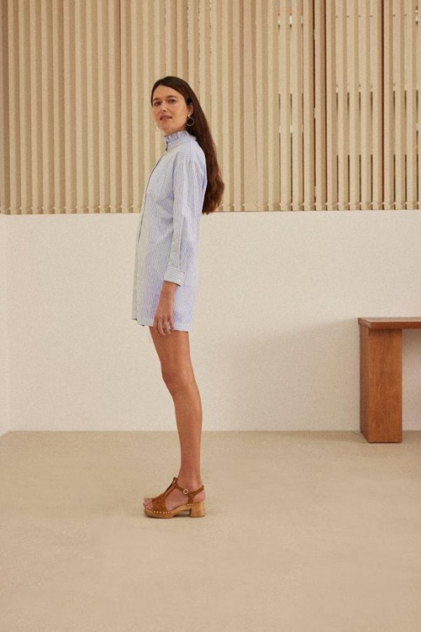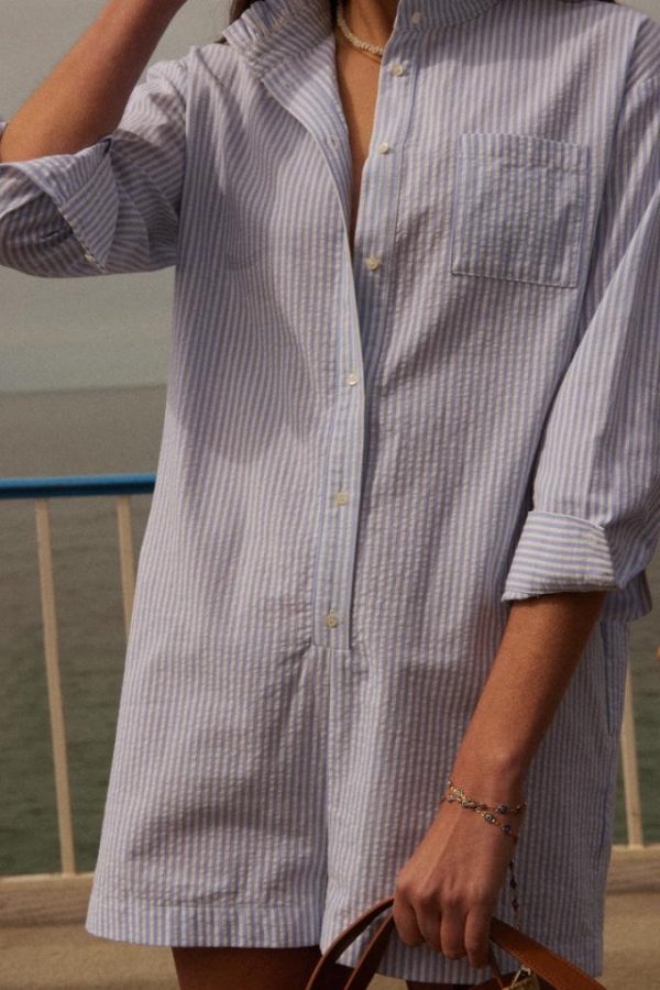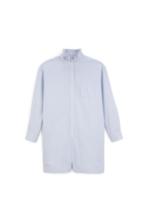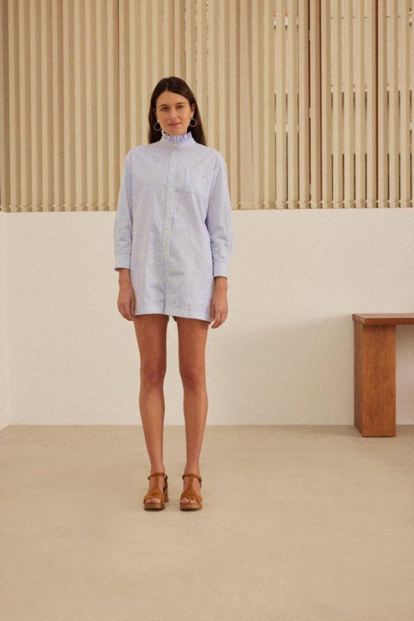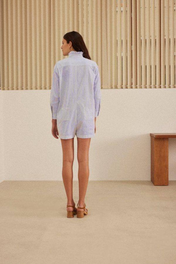 La combinaison Papille se décline en rayures bleu ciel et blanc. Enfilez-la facilement avec sa patte de boutonnage sur le devant.