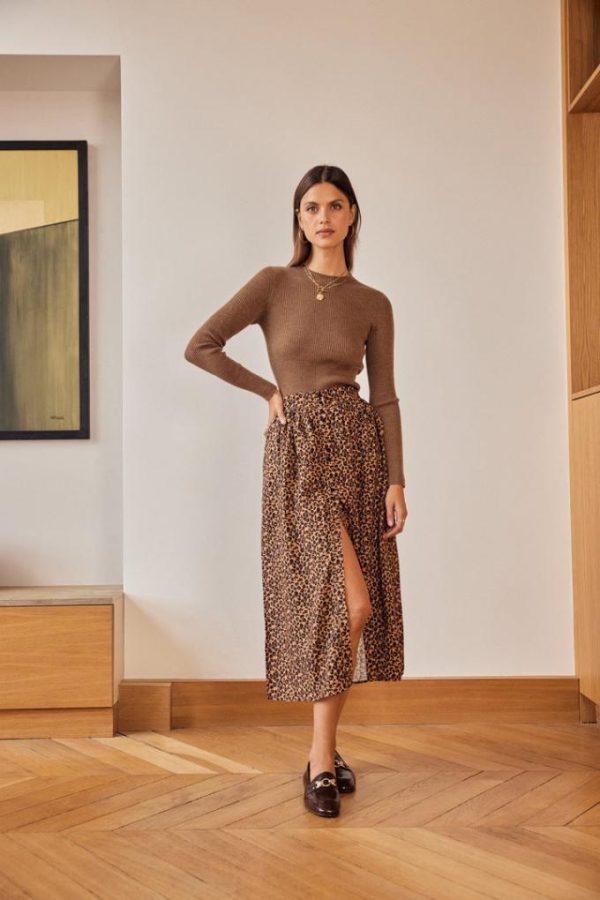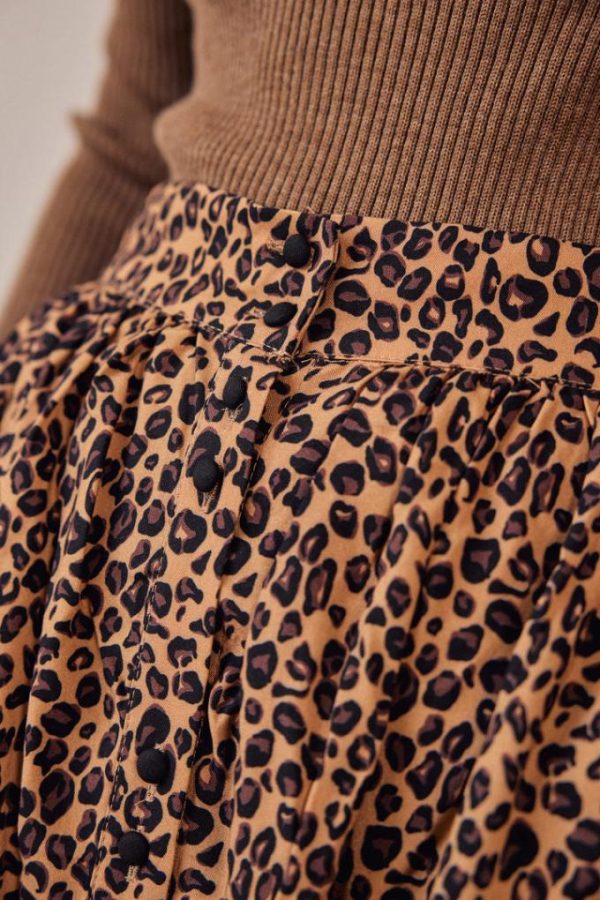 La mythique jupe Sally réinterprétée dans un imprimé léopard intemporel. Sa coupe taille haute et son tombé fluide subliment la silhouette pour un style rétro résolument moderne.