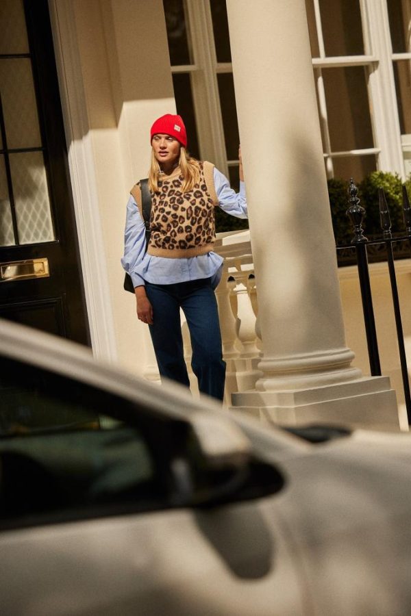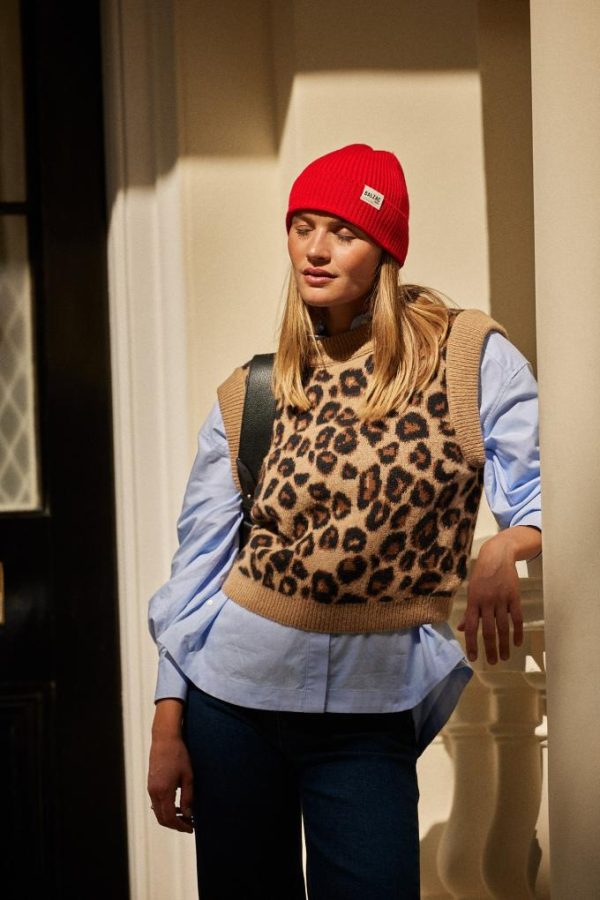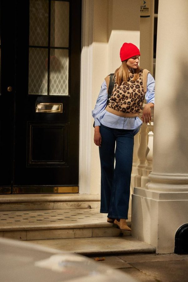 Pull sans manches léopard, très doux. À porter à même la peau ou sur une chemise blanche, il twiste une tenue en un clin d’œil.
