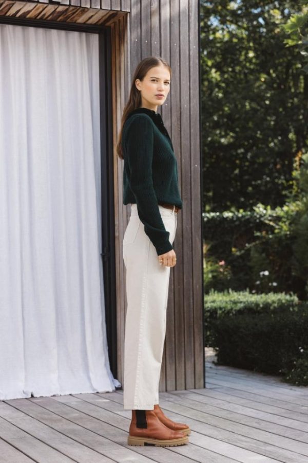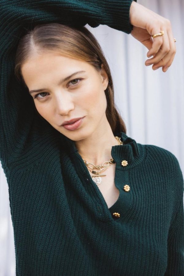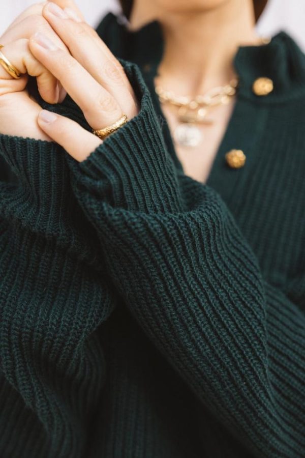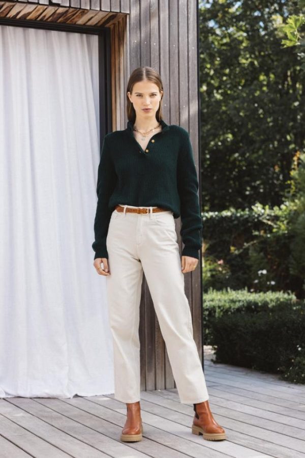 Le pull Paula vert forêt c’est le coup de coeur de l’équipe Balzac Paris avec son col et sa petite patte de boutonnage.