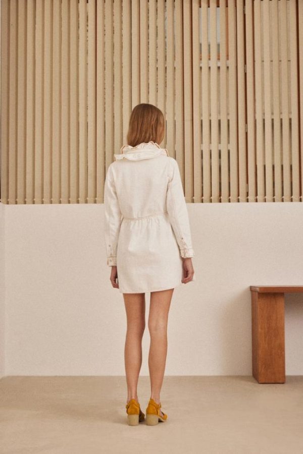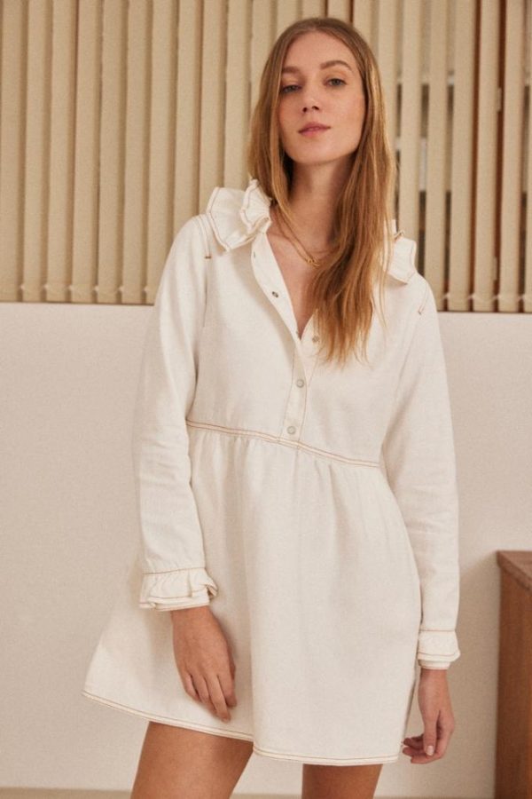 On adore la robe Belkis blanc perle avec ses volants élégants au col, sa taille cintrée et froncée et sa jolie patte de boutonnage.