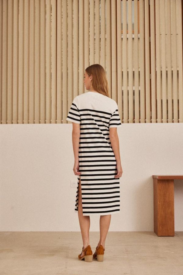 La robe Claodia à rayures noires, féminine grâce à sa fente sur le côté et sa coupe évasée au niveau des hanches. Simple et efficace à porter pendant la saison estivale.