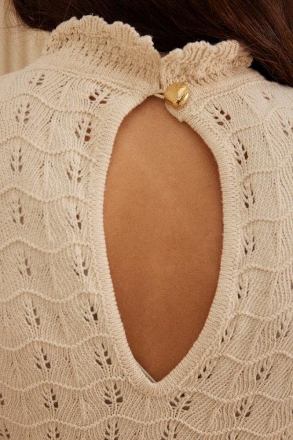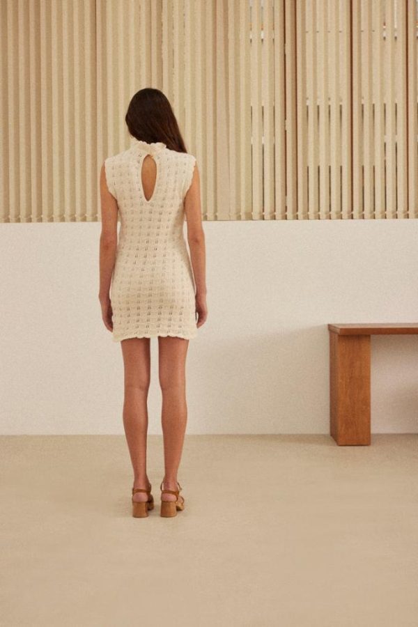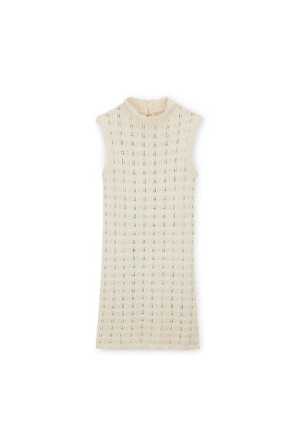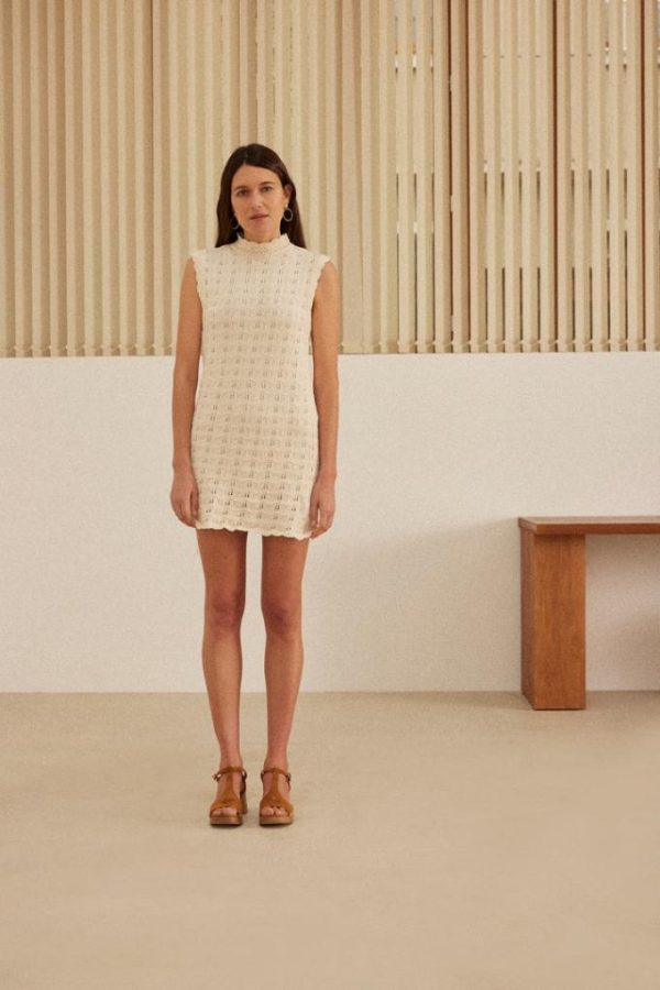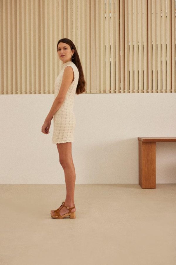 La robe Dunette écru se différencie par sa coupe droite et le fait qu’elle soit sans manches.