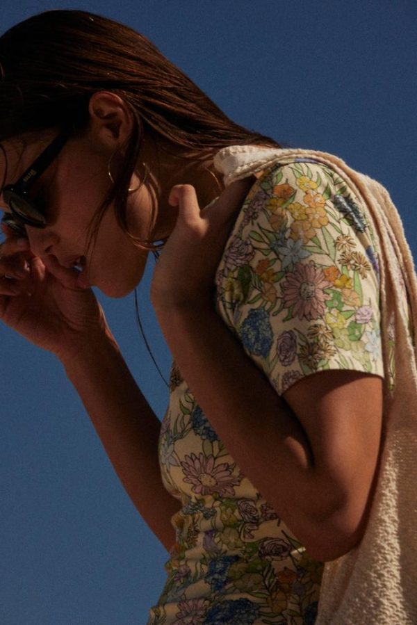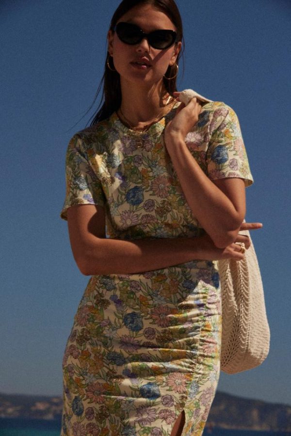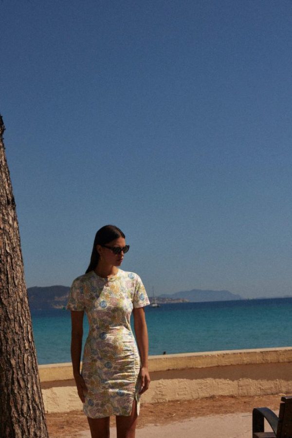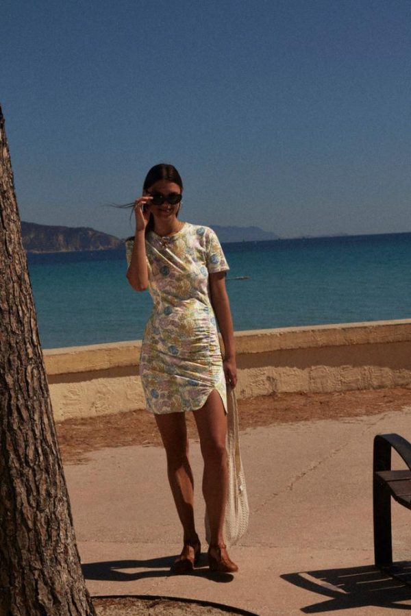 La robe Floréal imprimé fleurs d’été se porte près du corps et donne une silhouette élancée avec sa fente sur le côté.
