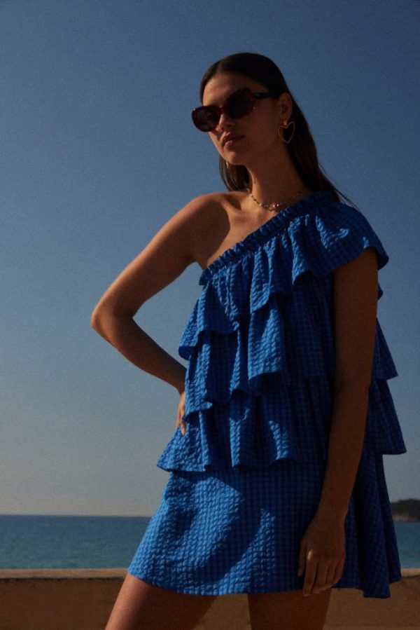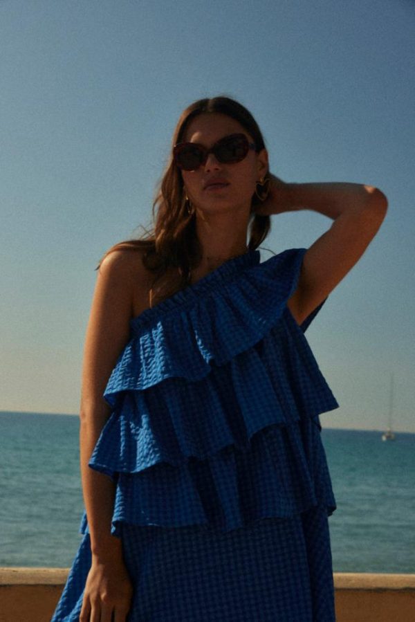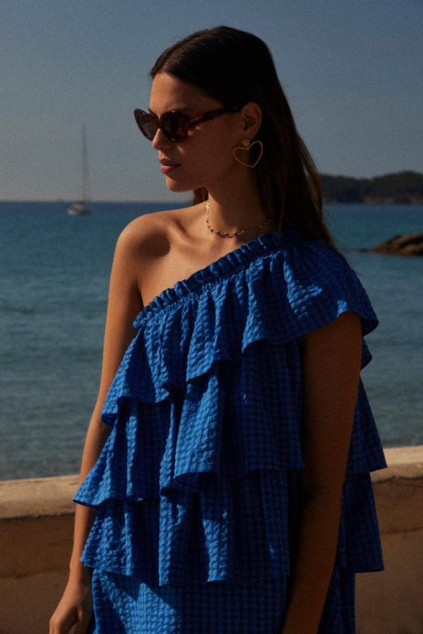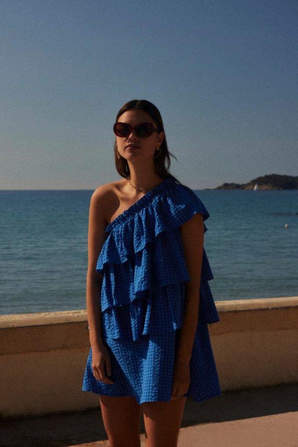 Avec son haut asymétrique et ses volants, la robe Nouba vichy bleu c’est la robe estivale par excellence !