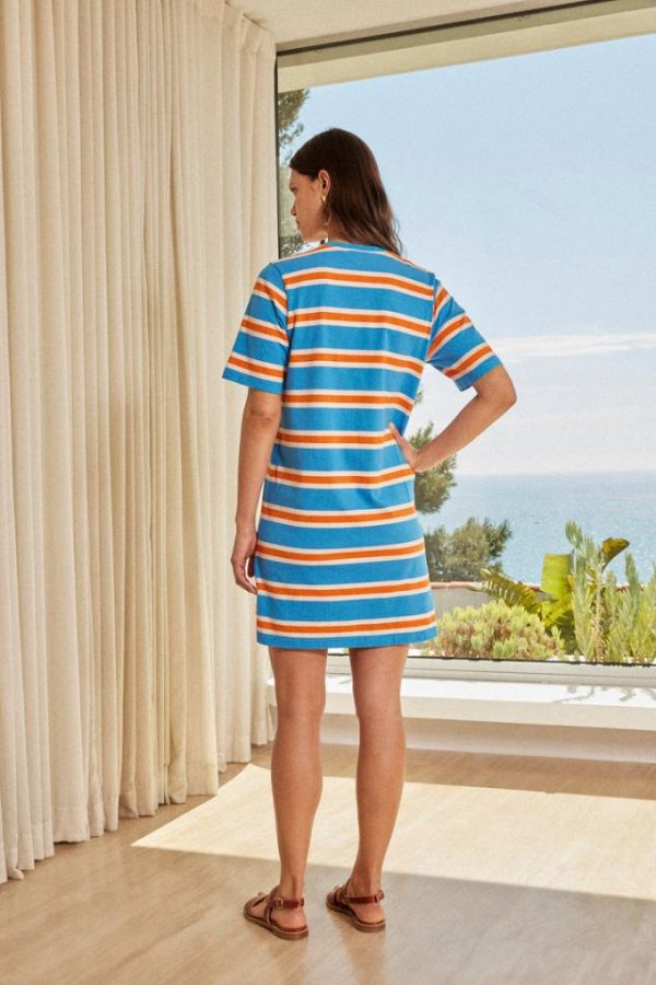 La robe Réjouissance aux rayures bleu et orange dévoile une silhouette d’une élégance contemporaine. Pièce polyvalente par excellence, elle sublime votre tenue professionnelle comme vos escapades balnéaires.