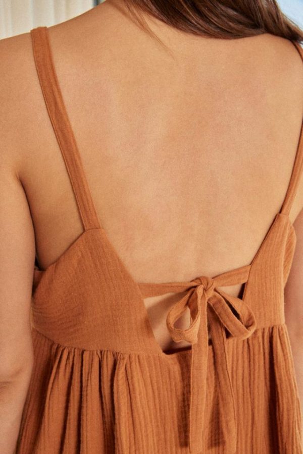 La robe Samba cannelle a tout pour plaire : un lien à nouer dans le dos pour orner votre dos nu et une jolie patte de boutonnage.