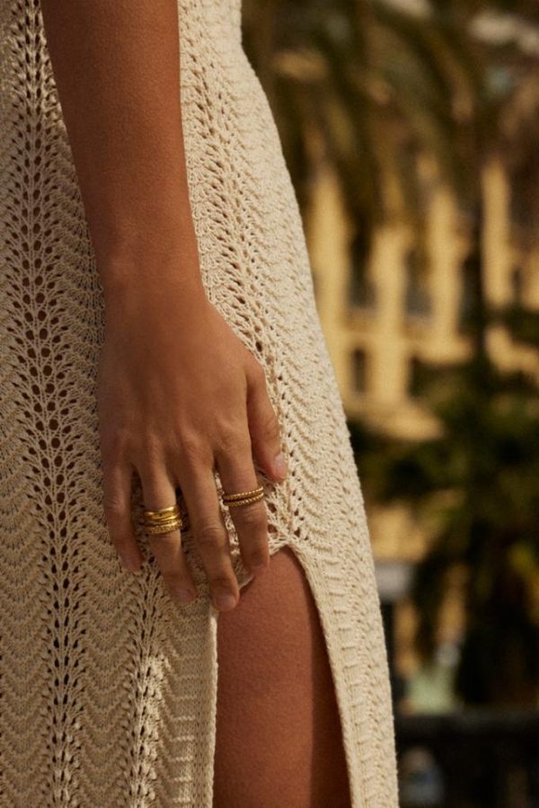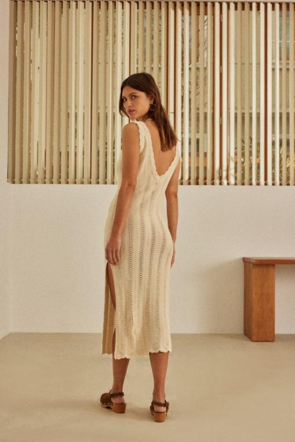 La robe Sarriette écru, très mode avec ses détails en crochet et son décolleté plongeant sur le devant et dans le dos, se porte au quotidien comme à la plage.