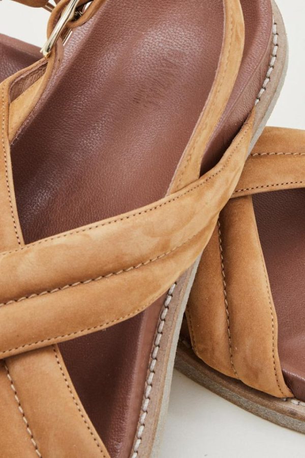 Simples et modernes, les sandales Petra nubuck camel s’attachent grâce à leur boucle sur le côté.
