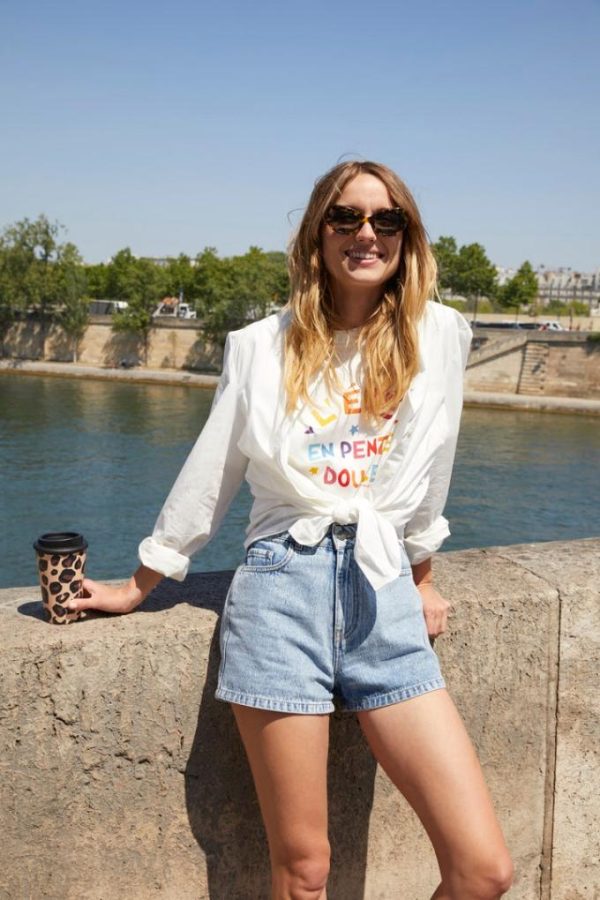 Le mini short Triomphe bleu glacier sublime votre silhouette avec une blouse raffinée ou un débardeur léger, pour une élégance absolue dès les premiers rayons de soleil.